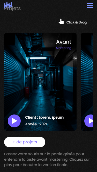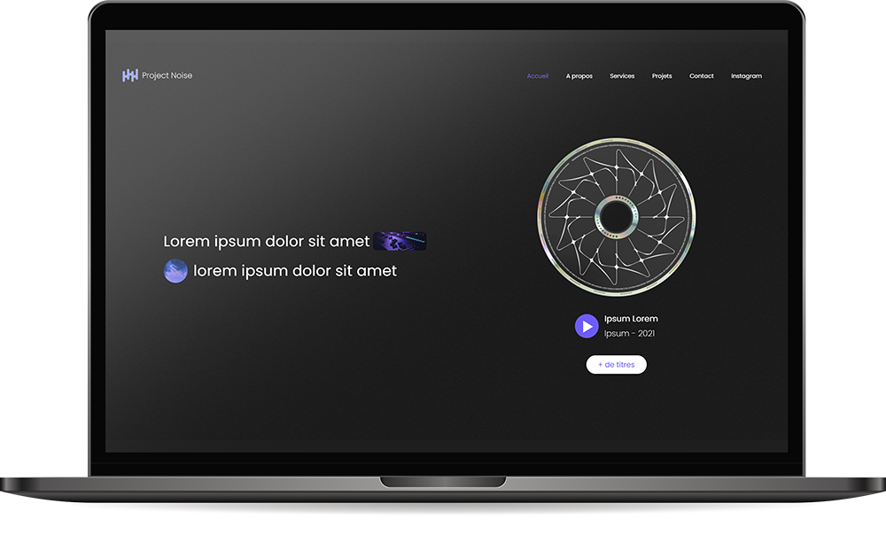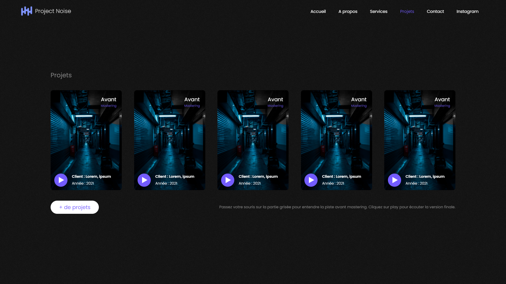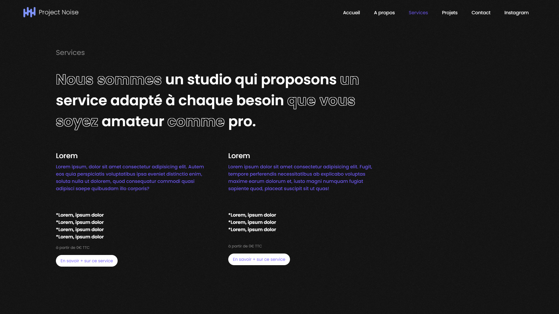 Réalisé en duo avec un UX/UI Designer et développeur, Project Noise est né d'une volonté d'apporter du nouveau dans l'esthétique de la prestation musicale. Nous nous sommes rendus compte que ce milieu peinait à se démarquer graphiquement, la distinction entre les différents studios se faisant sur la base de la production audio. Notre travail a donc consisté à rendre cet univers plus esthétique, moderne et attrayant.